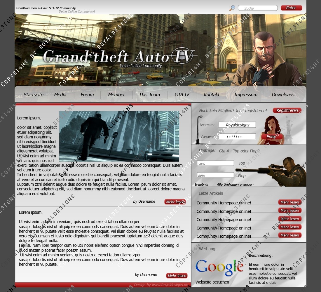 Das Design ist an eine Community angelehnt. Speziell auf eins für das berühmte Spiel des Jahres "Gta IV". Es sind einige elemente eingearbeitet worden, z.b. in dem Loginbereich und weiter runter. Die Gestaltung nimmt die Farben Rot / Weiß an und so ist es geblieben, schlicht und einfach gehalten.Im Packet wären folgende Sachen enthalten: - .psd Datei des Designs - WerbebannerHeader und weitere kleinigkeiten können kostenFREI geändert werden.