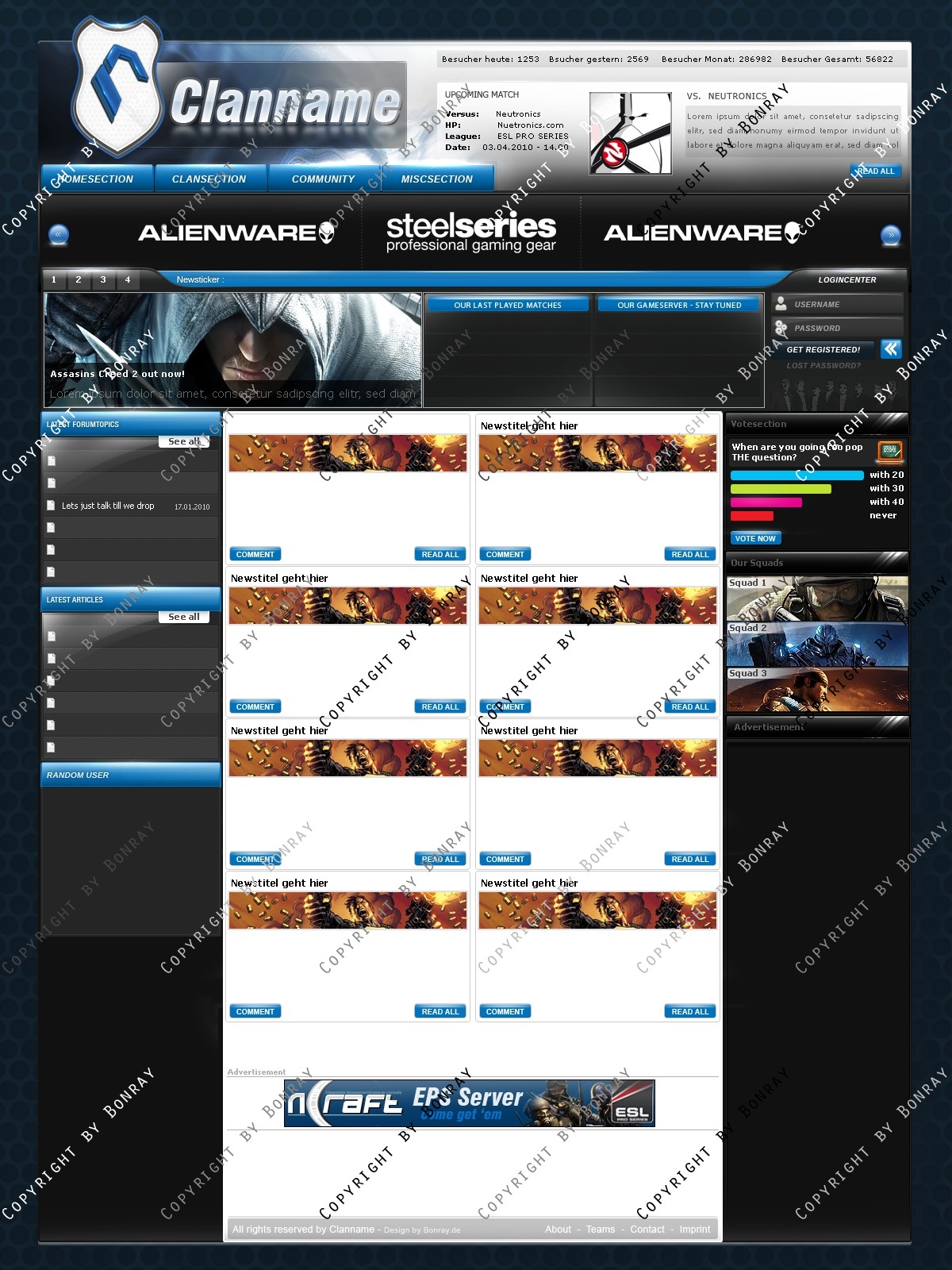 ich biete hier ein frisches, hochwertiges Clandesign in modernen Farben an. Das Design lässt sich einfach slicen und aufgrund des simplen Aufbaus leicht an gängige CMS Systeme wie Webspell und DZCP anpassen. Das Design lässt sich eigenhändig mit allen gängigen Photoshop Version bearbeiten.