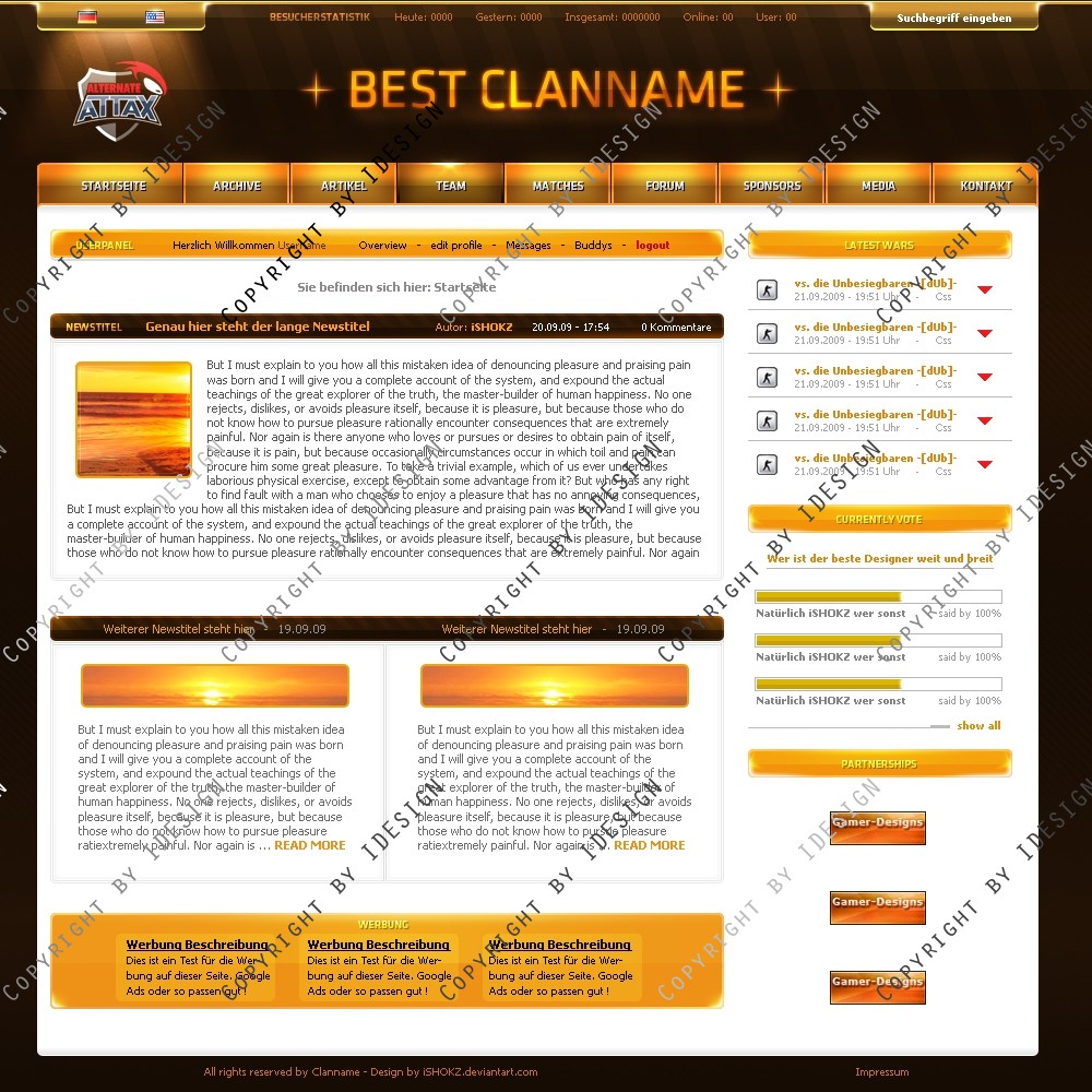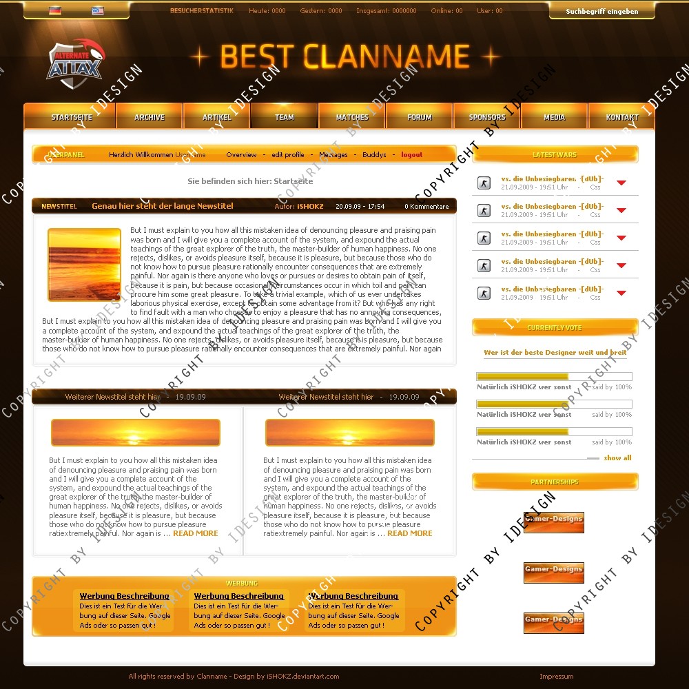 Professionelles Oranges Clandesign im derzeit angesagten schlichten Style. Doch auch einige klare Akzente setzt das Design durch Lichteffekte etc. Es ist besonders Userfreundlich durch den weißen Content.