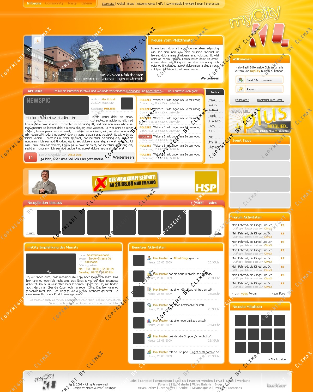 Stelle hier ein Layout für Event / Party Communitys zum Verkauf. Die Startseite sowie die Profilansicht stehen als Unterseiten bereit. Das Design war noch nie Online. Änderungen am Layout können natürlich auf Wunsch gemacht werden. Angeboten wird hier nur die .PSD Datei ohne jegliche Anpassung. Das Logo (myCity KL) dient nur als Platzhalter und ist nicht im Angebot mitenthalten. Bei Fragen stehe ich entweder hier oder in meinem Forum zur Verfügung.