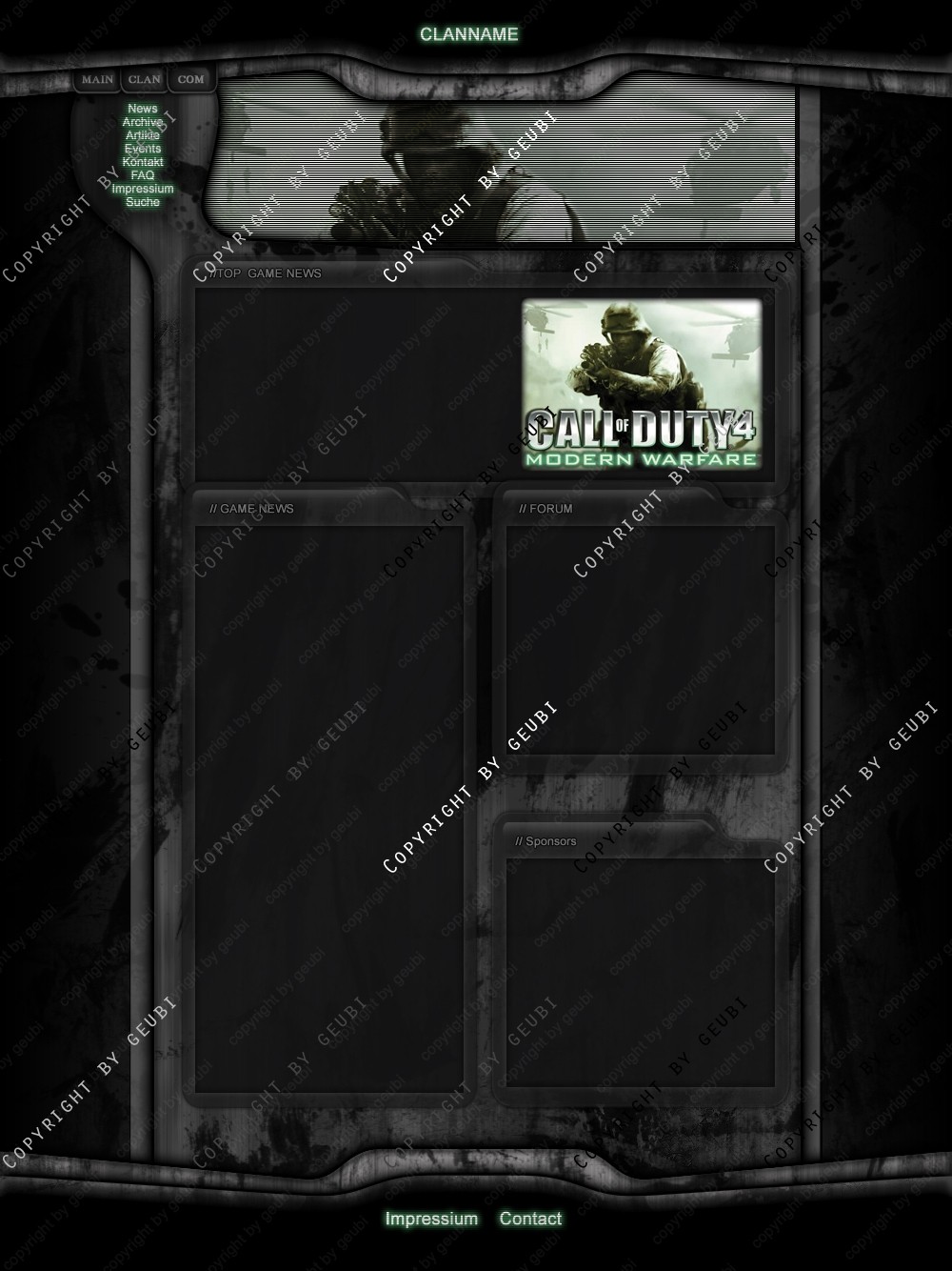 Ausgelegt auf das Spiel Call of Duty 4 bietet das gezeigte Projekt eine schnelle, und für den Kompetenten, eine individualiserende Möglichkeit einem anfänglichen oder schon aufstrebendem Team (ob Liga oder nicht sei dahingestellt) die erste Internetpräsenz aufzuziehen ohne dabei auf Anspruch und Qualität verzichten zu müssen.