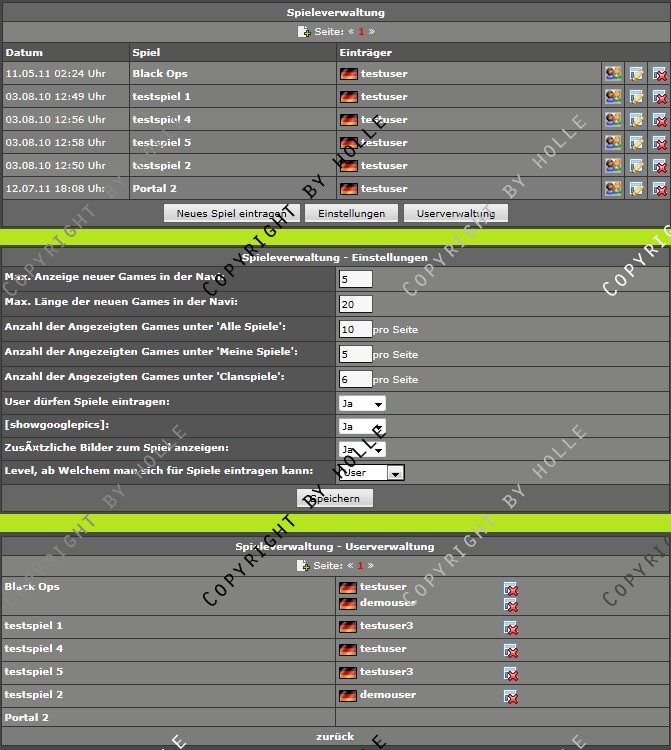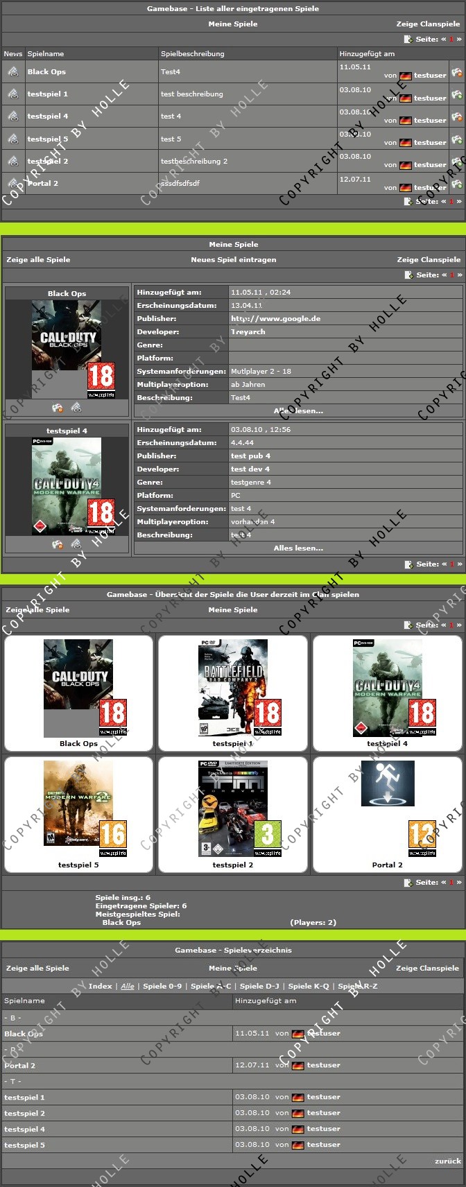 Angelehnt an das System der ESL habe ich hier eine Verwaltung für Spiele im Clan oder in der Community gecode, für die sich Member eintragen können. Zusätzlich können die Member im Clan eigene Spiele einreichen, indem sie ein Formular ausfüllen. (Dieses Feature kann aber vom Admin abgeschaltet werden)